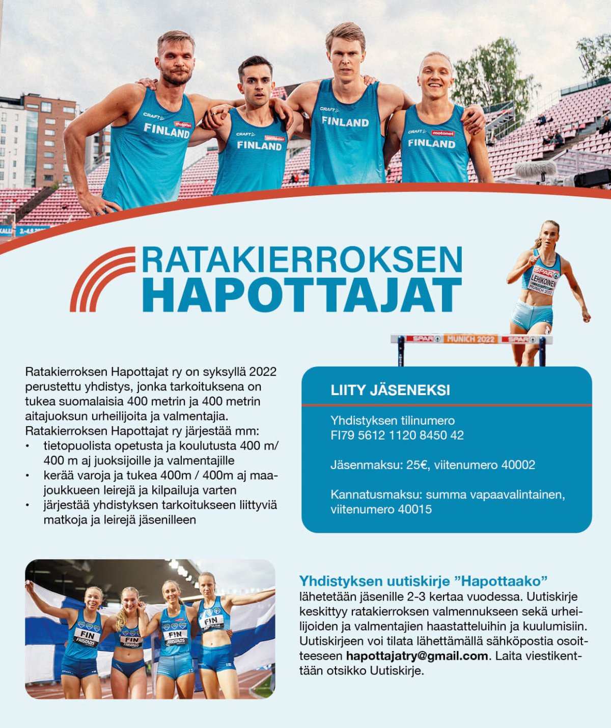 Yhdistys tukee suomalaisia 400 metrin juoksun ja 400 metrin aitajuoksun urheilijoita ja valmentajia.